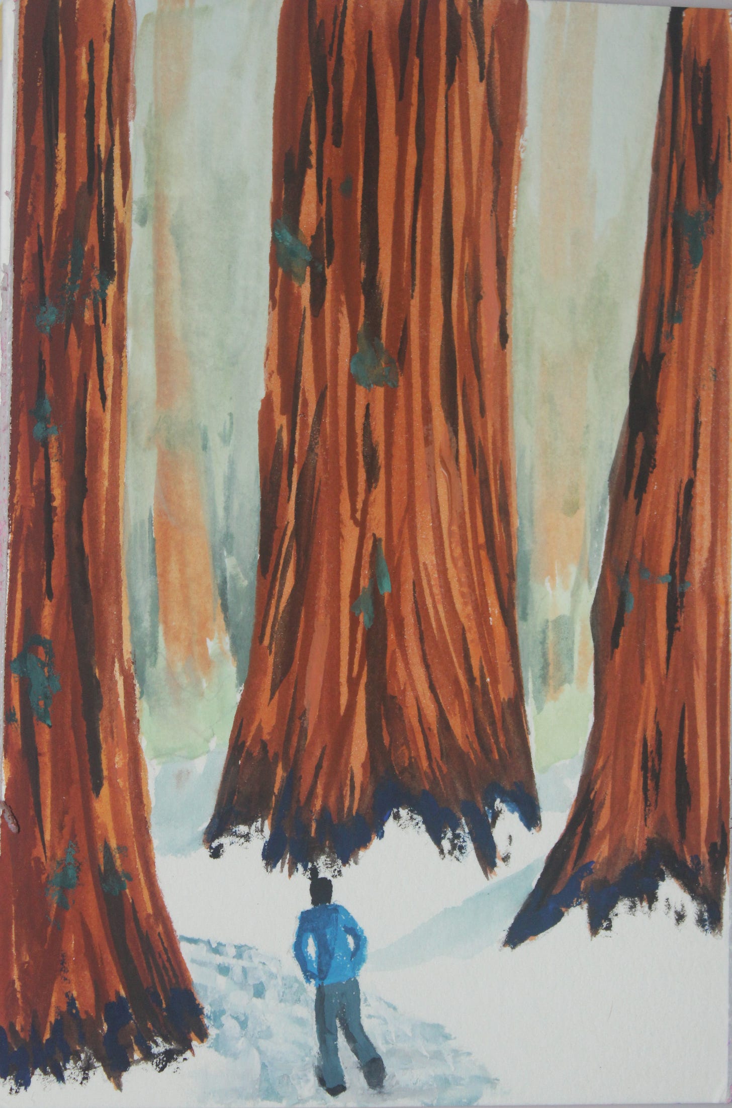 It’s Monday, time to reset and start a new week. I cranked out another postcard before heading to the gym. California this time. Sorry about the misproportioned hiker, I need years of practice in drawing and painting people. Hold that thought.